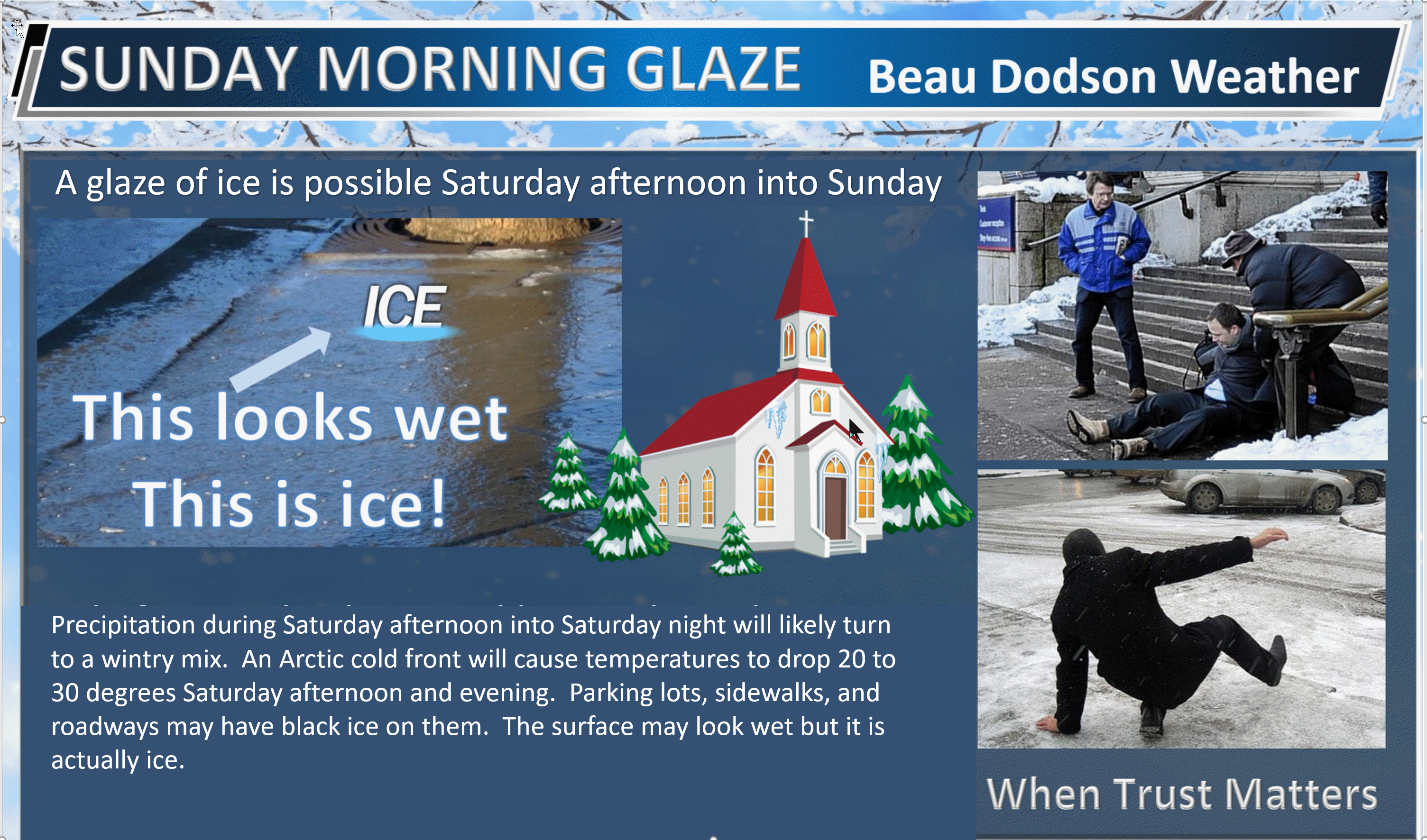 What impacts are anticipated from the weather? Icy roads. Blowing snow in some areas. Black ice. Bitterly cold wind chill values.