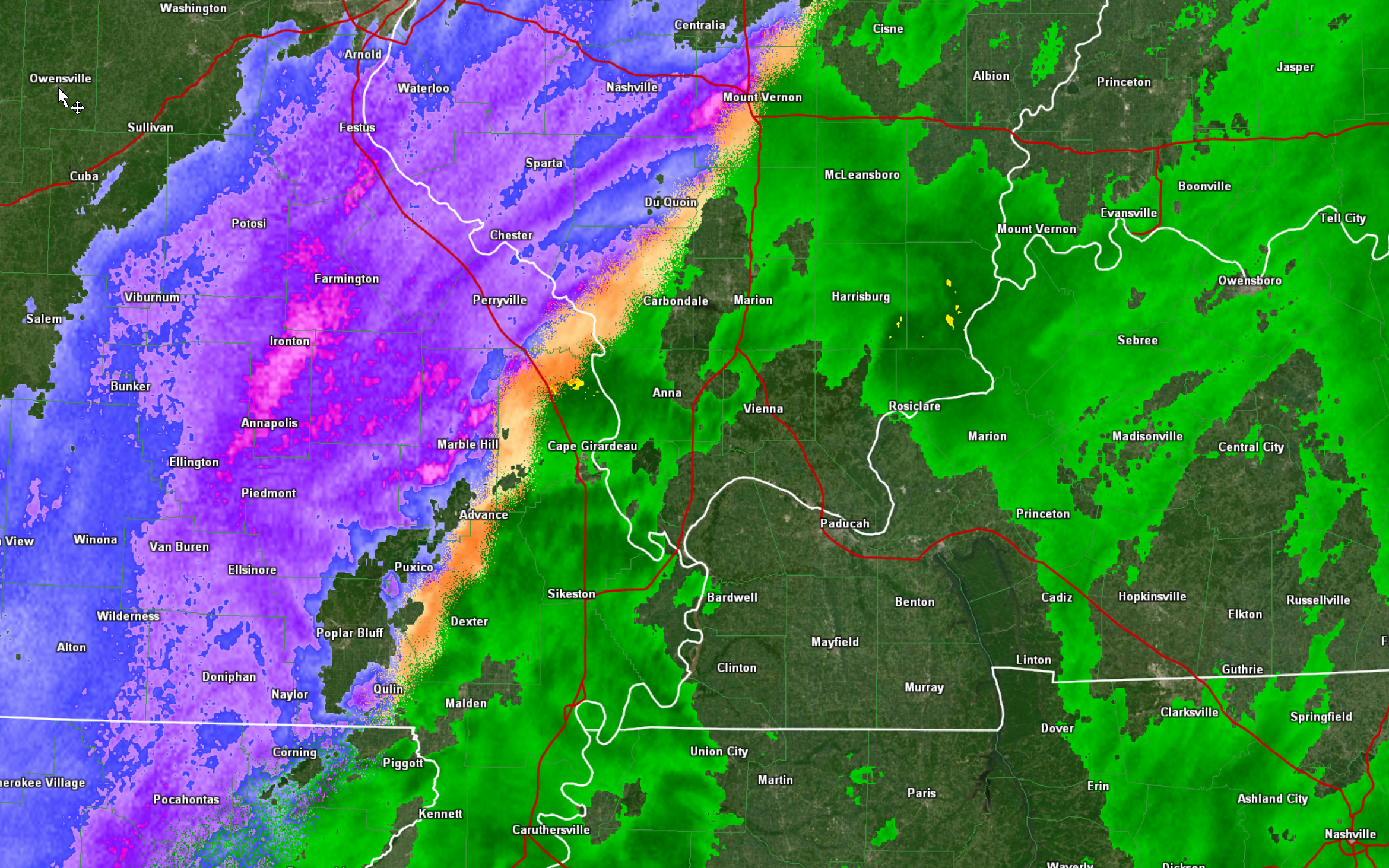 Sleet has reached Cape Girardeau, MO and Marion, IL