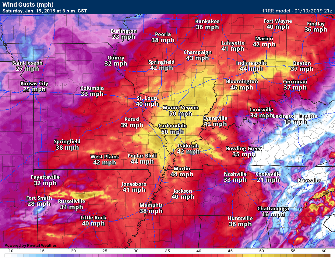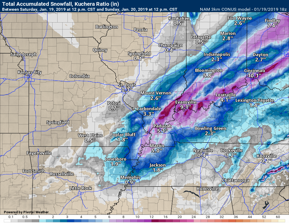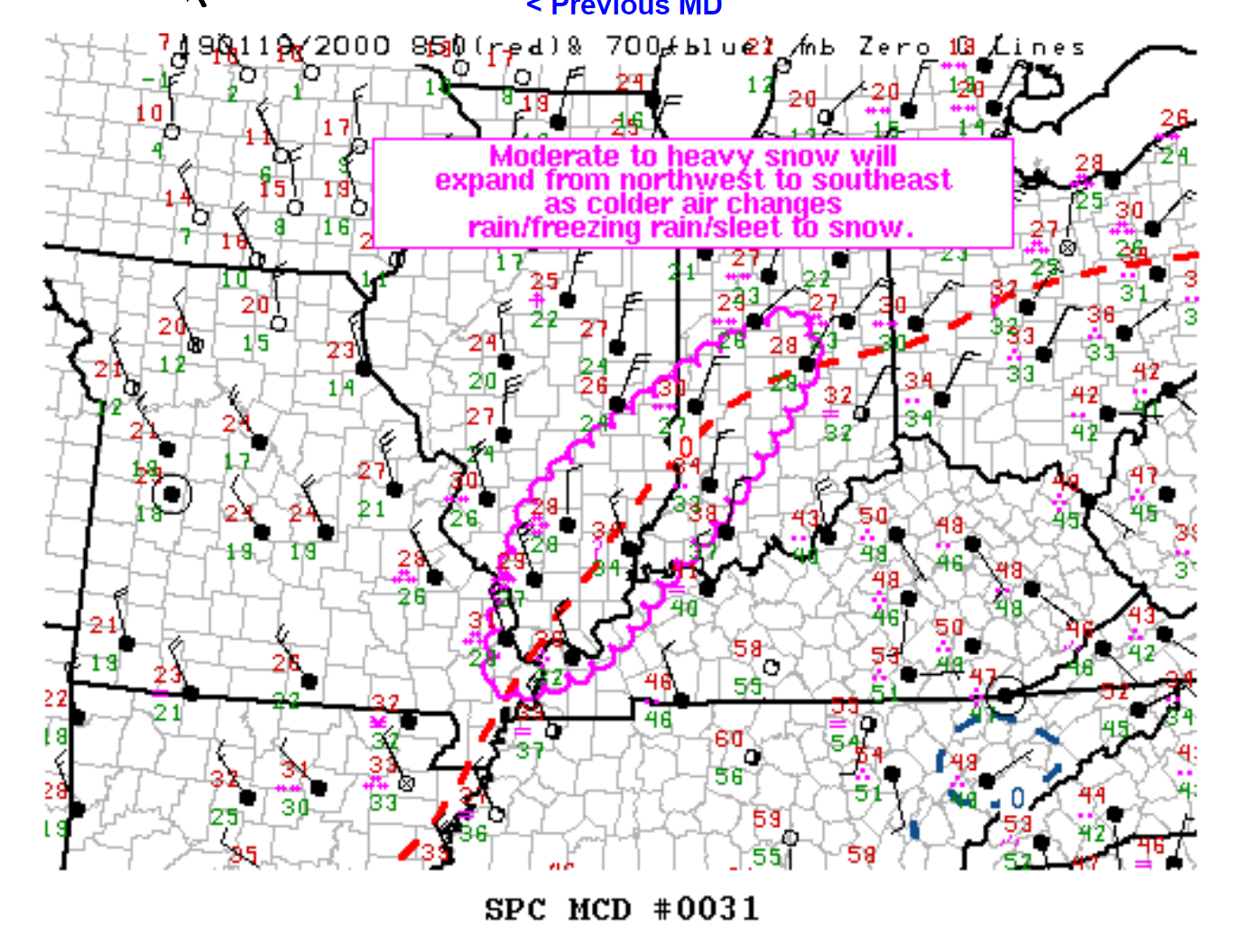 Mesoscale Discussion 0031 NWS Storm Prediction Center Norman OK 0321 PM CST Sat Jan 19 2019 Areas affected...Southern Illinois...far western Kentucky...and west central into central Indiana. Concerning...Heavy snow Valid 192121Z - 200015Z SUMMARY...Rain, freezing rain, and sleet will continue to transition to snow from northwest to southeast with moderate to heavy snowfall expected across this area through the remainder of the afternoon and into the evening. DISCUSSION...In the last hour, winds have shifted to northerly up to 2 km on the KIND and KVWX VWP as the 850mb low has started to shift east of that longitude. This has started to switch rain to snow across portions of this area with a continued transition expected over the next several hours. The developing deformation band will likely have snowfall rates in excess of an inch per hour. Therefore, significant snowfall accumulations are likely through the evening before the system shifts east and drier air moves into the area. In addition to the impacts from the rapidly accumulating snowfall, winds of 20 to 30 mph with gusts as high as 40 mph will cause significant blowing and drifting and visibility restrictions. This will become particularly impactful during the evening hours as a colder airmass advects into the area and leads to a drier snow which will be more prone to blowing and drifting. ..Bentley.. 01/19/2019