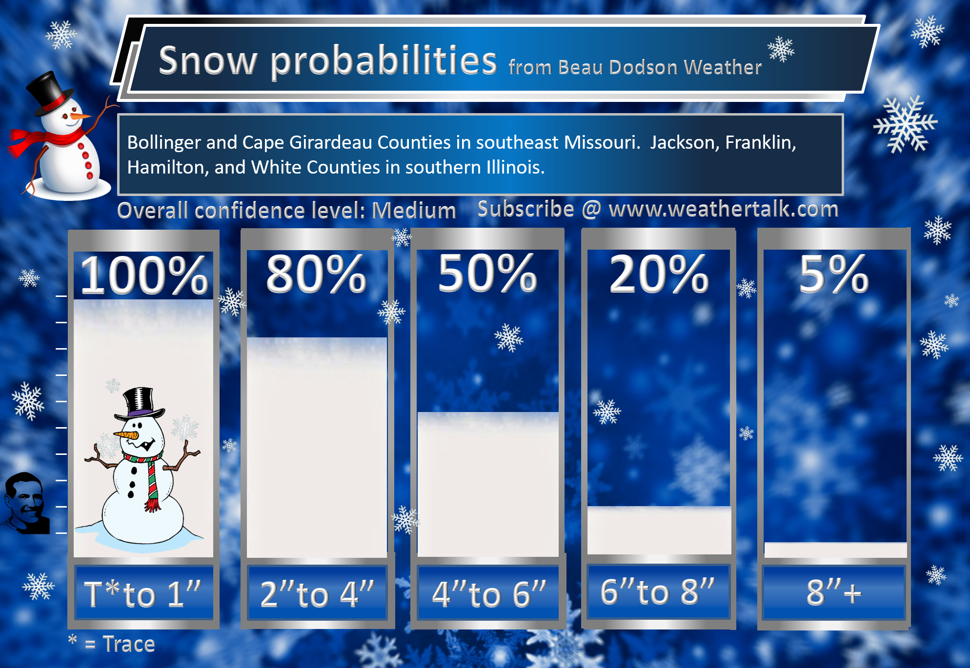 Temperature range: MO Bootheel 16° to 18° SE MO 14° to 18° South IL 14° to 18° West KY 14° to 18° NW TN 18° to 24°