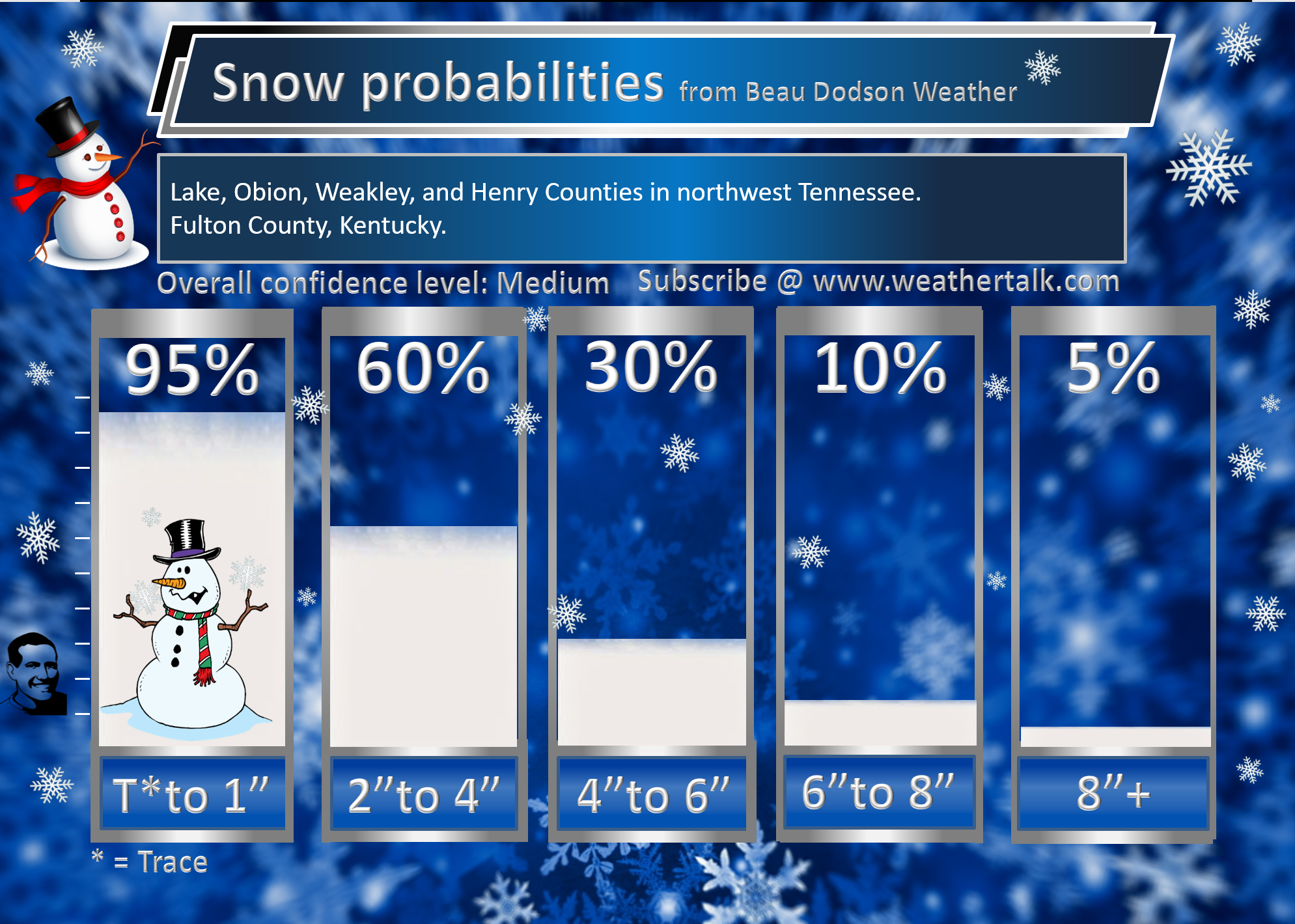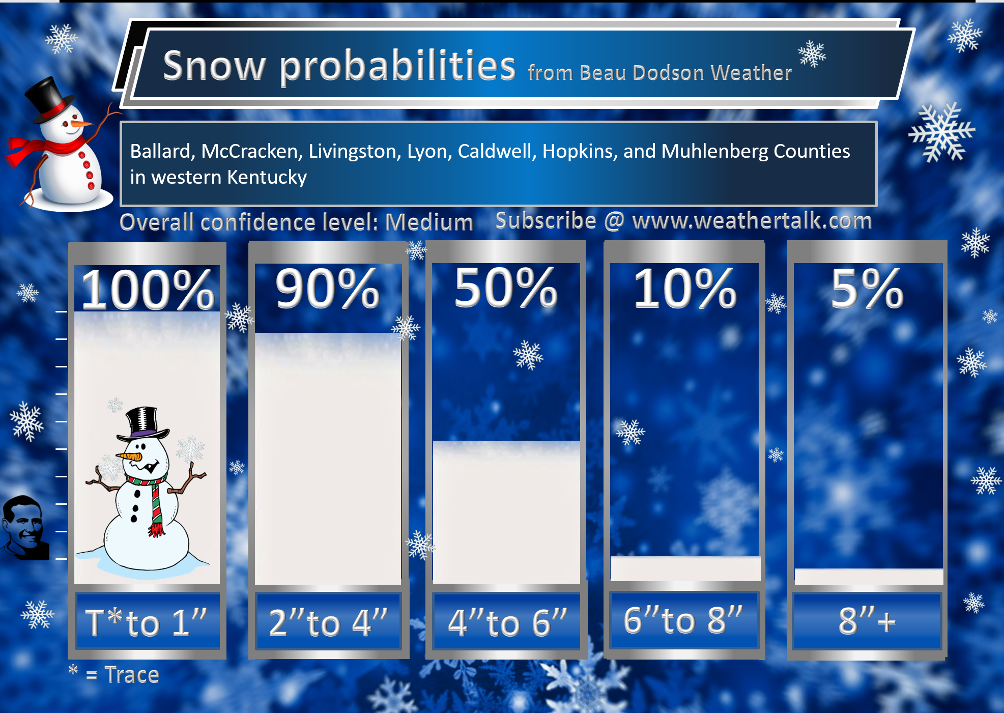 Will there be accumulating snow or ice? Yes. A one to four-inch snow event will occur in most counties. A band of three to six inches likely across the middle portion of the region. Blowing and drifting snow.