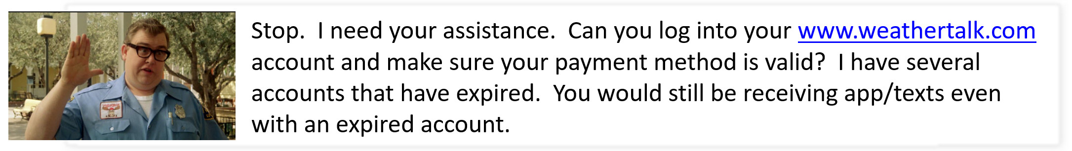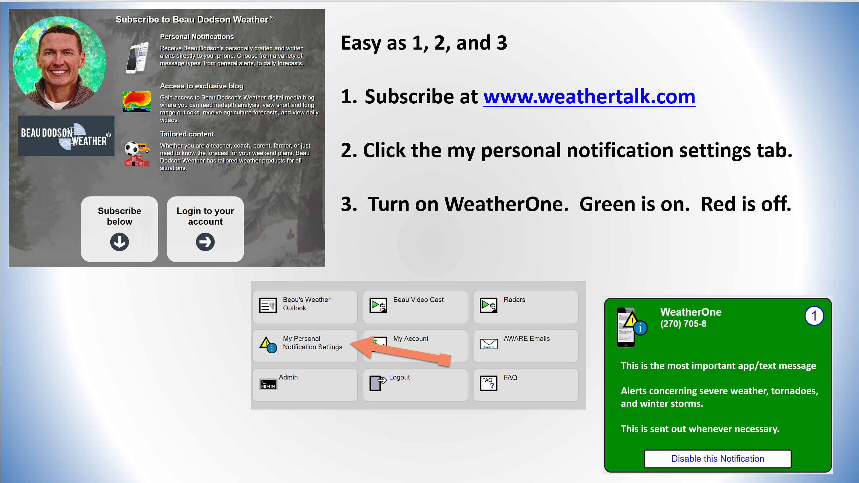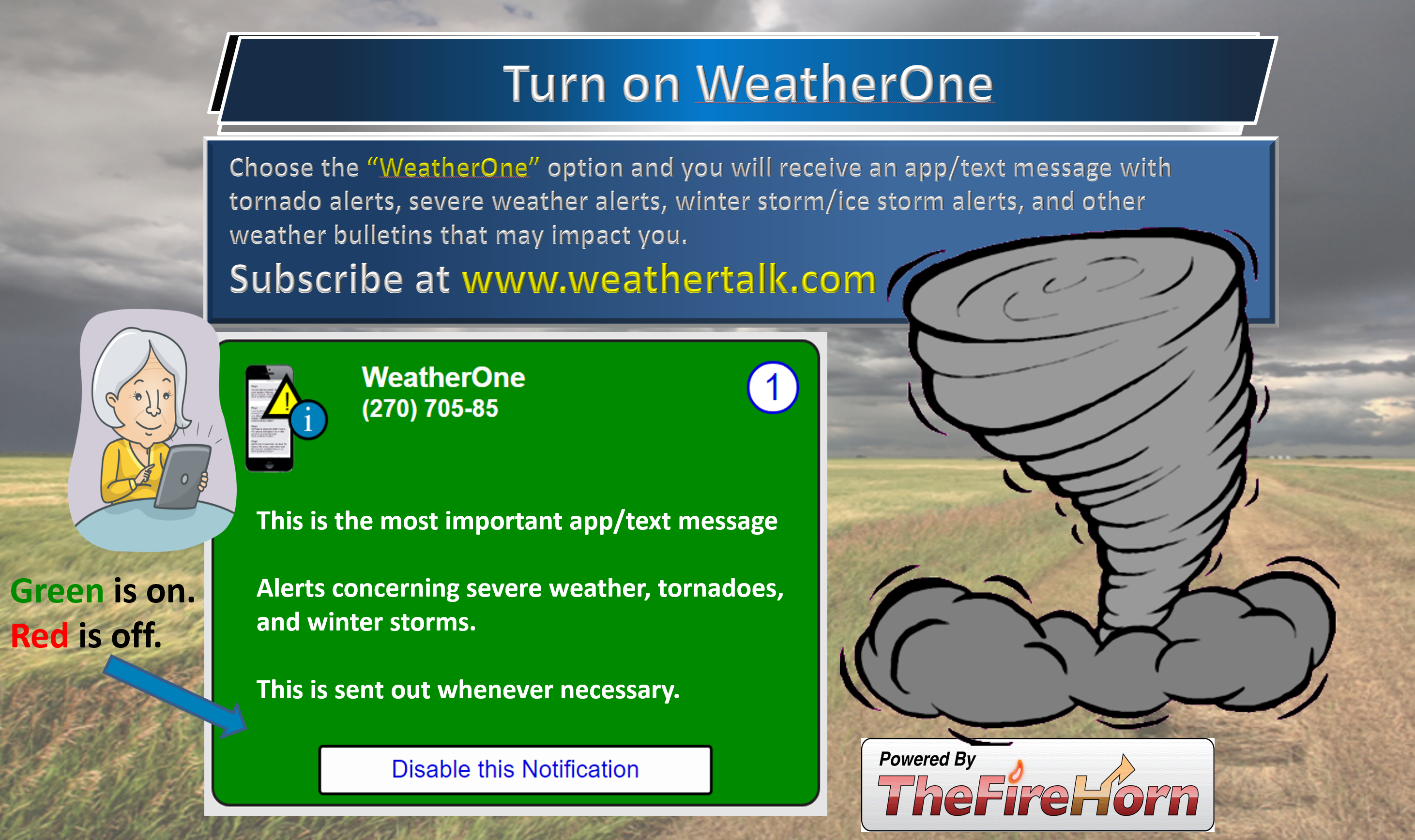 - Make sure you have the correct app/text options turned on. Do that under the personal notification settings tab at www.weathertalk.com. Red is off. Green is on.