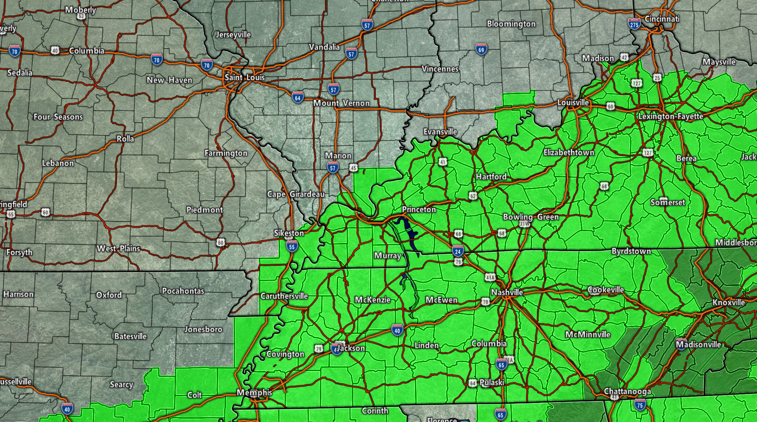 What is the chance/probability of precipitation? MO Bootheel 100% Southeast MO 70% Southern IL 70% Northwest KY (near Indiana border) 70% Western KY 90% NW TN 100%