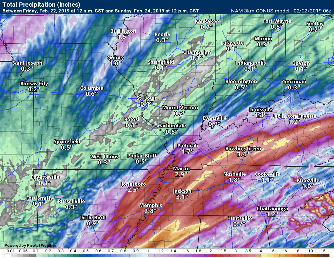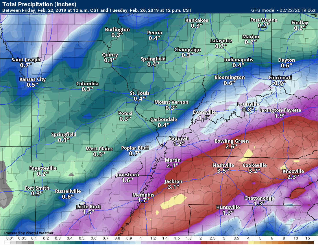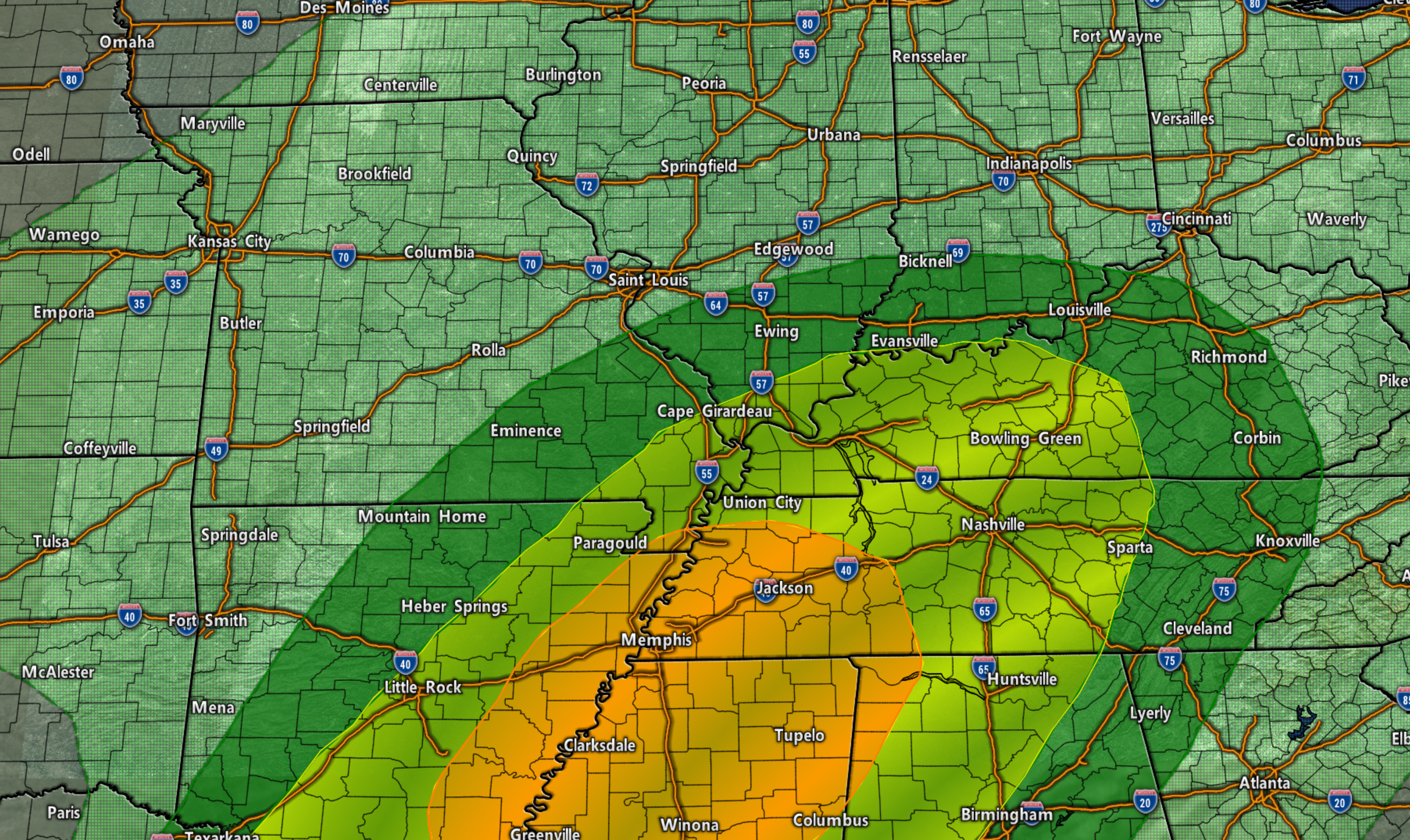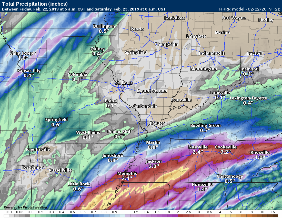 Friday night Forecast: Showers and thunderstorms developing. Locally heavy rain, especially from the Missouri Bootheel into parts of western Kentucky and Tennessee. Rising temperatures overnight.