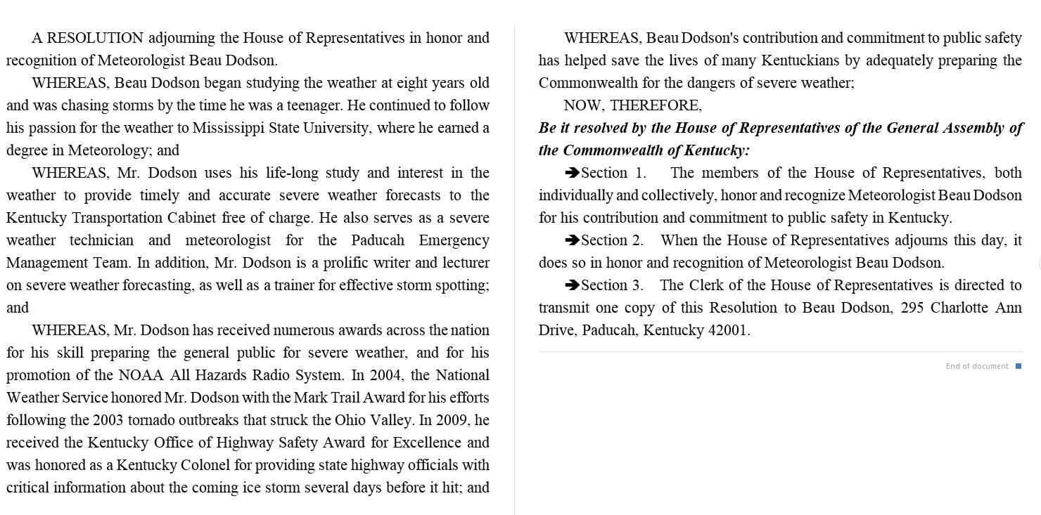 I was recognized by the Kentucky House of Representatives for my service to the State of Kentucky leading up to several winter storms and severe weather outbreaks.