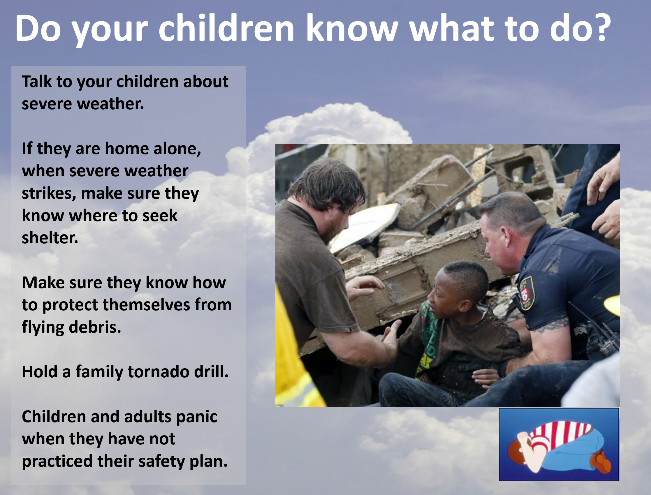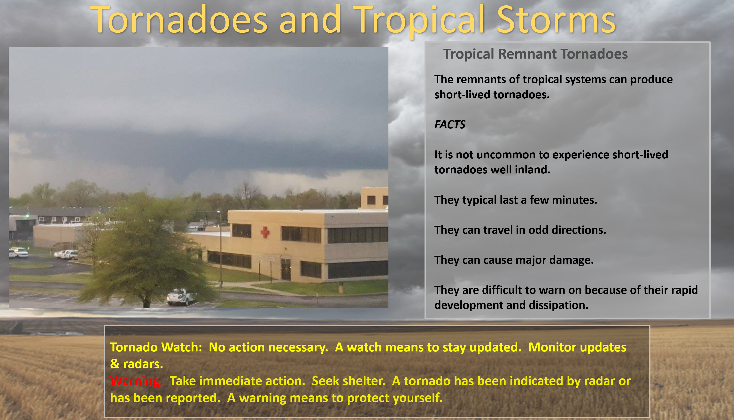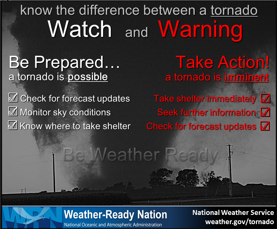 Remember, a watch means to go about your business and monitor updates. A warning means to move to a safe place of shelter until the storm passes.