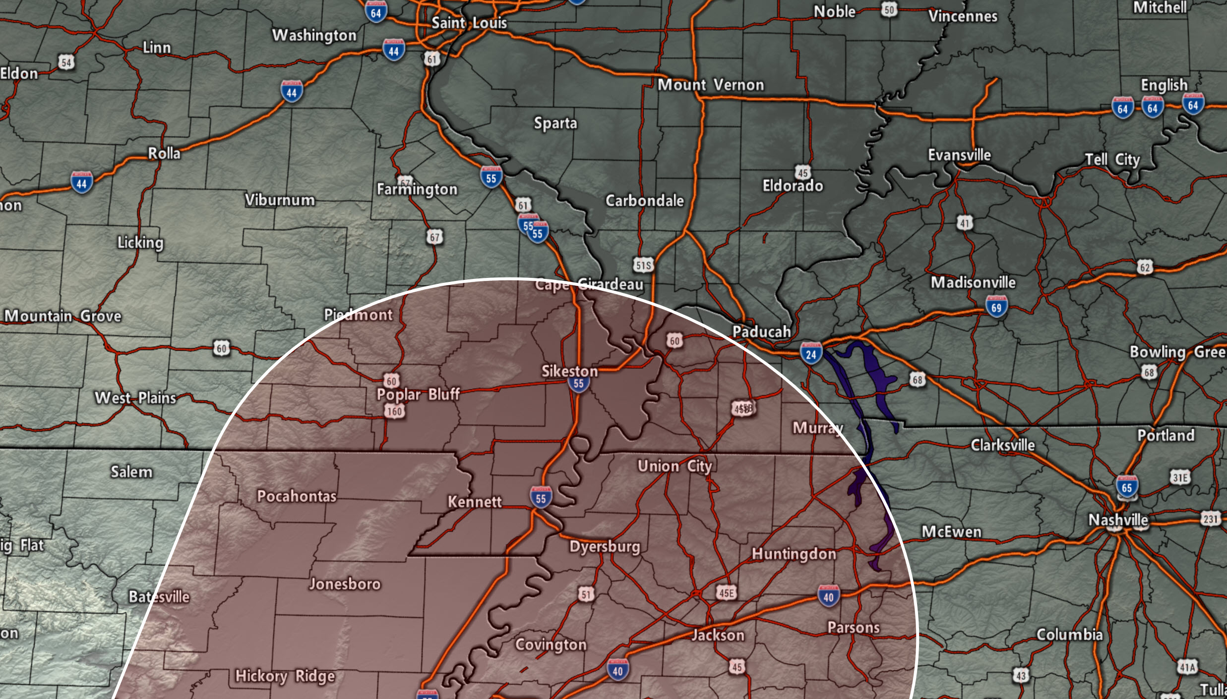 Dunklin, Pemiscot, New Madrid Counties, MO. Carlisle, Hickman, & Fulton Counties. General heads up that incoming storms could produce isolated 50+ mph wind gusts. Heavy rain/lightning. Be aware.