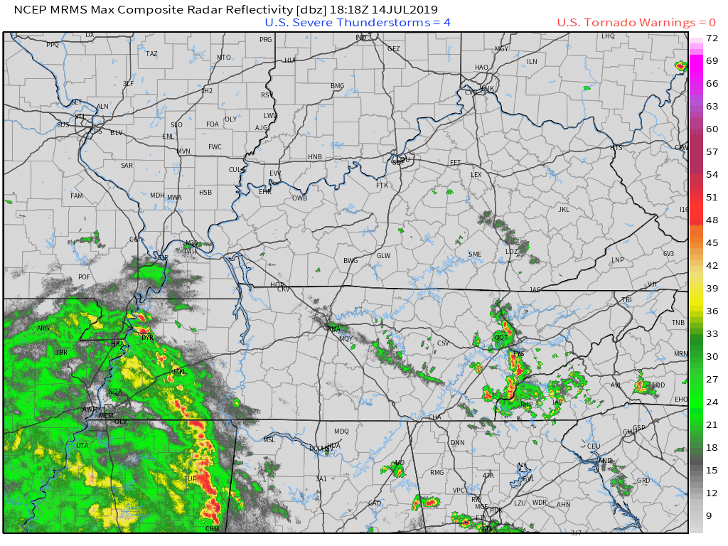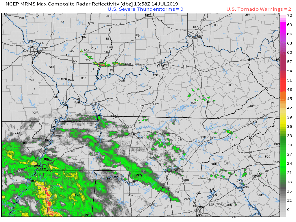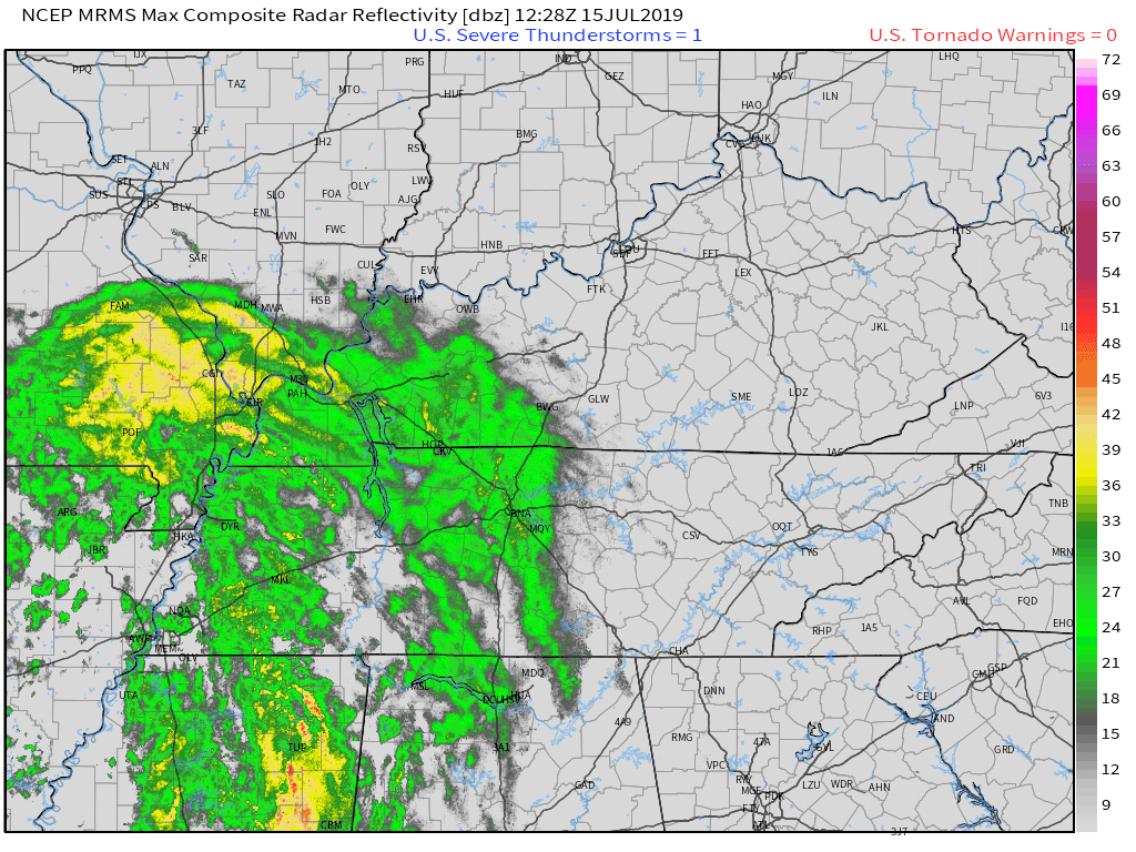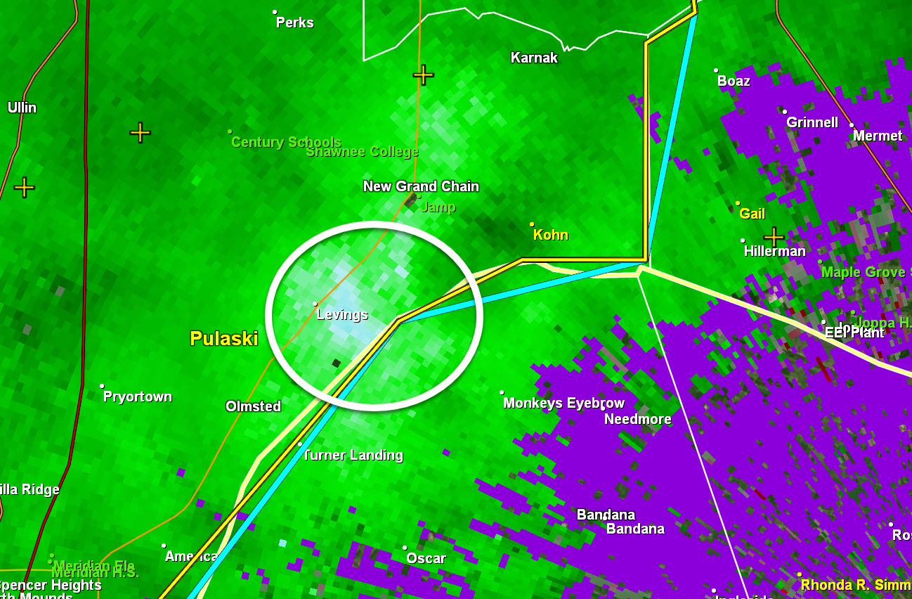 7:20 PM Johnson and Pulaski Counties. Ballard and Mississippi Counties. Radar shows incoming storms with isolated patches of 50+ mph winds. Wet ground conditions could make it easier for a tree to topple. Be aware as they move east at 15 to 20 mph.