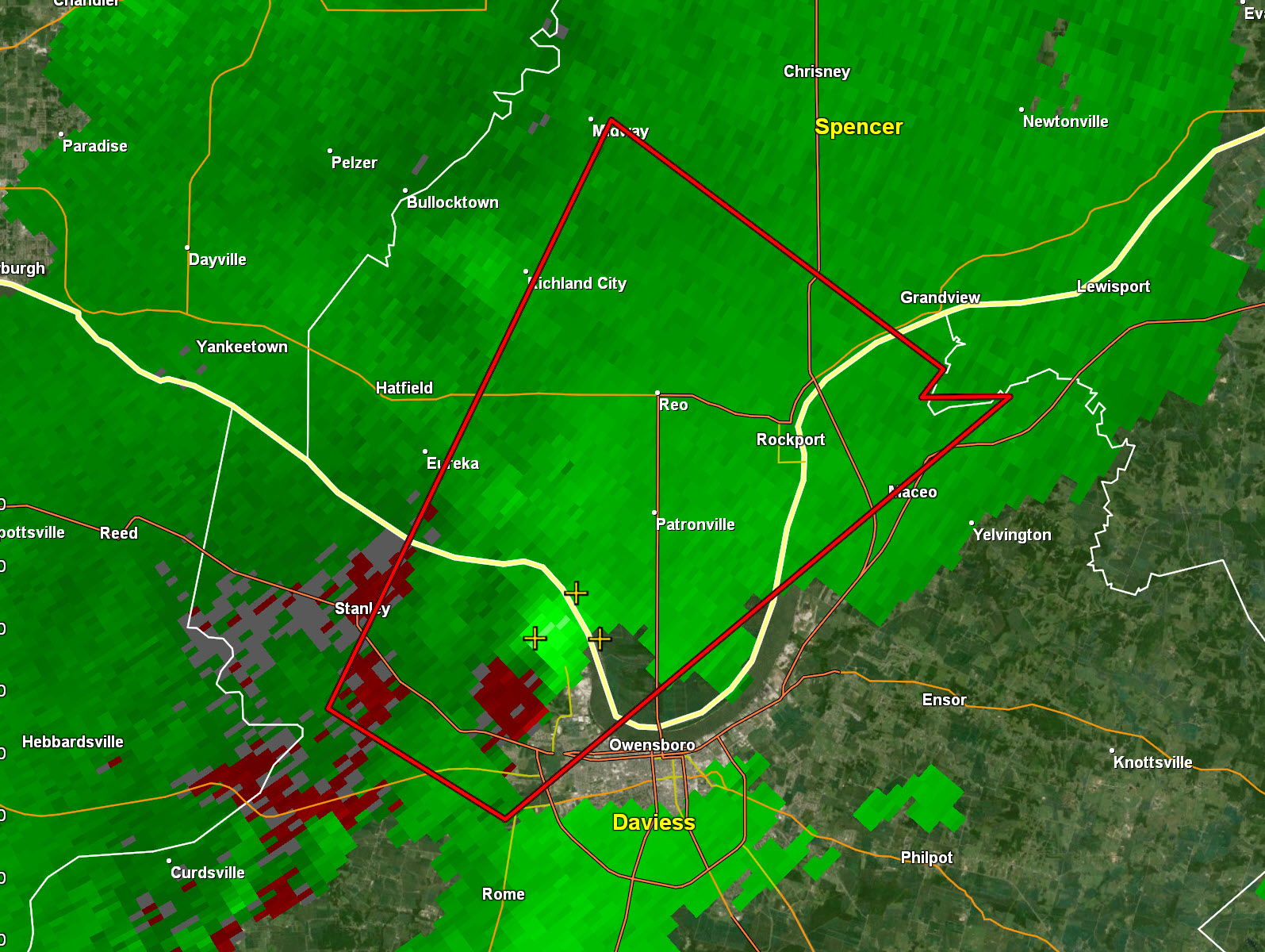 Radar shows a very small area of 50+ winds now NW of Bandana, KY. Winds elsewhere are much lower. A very small area now.