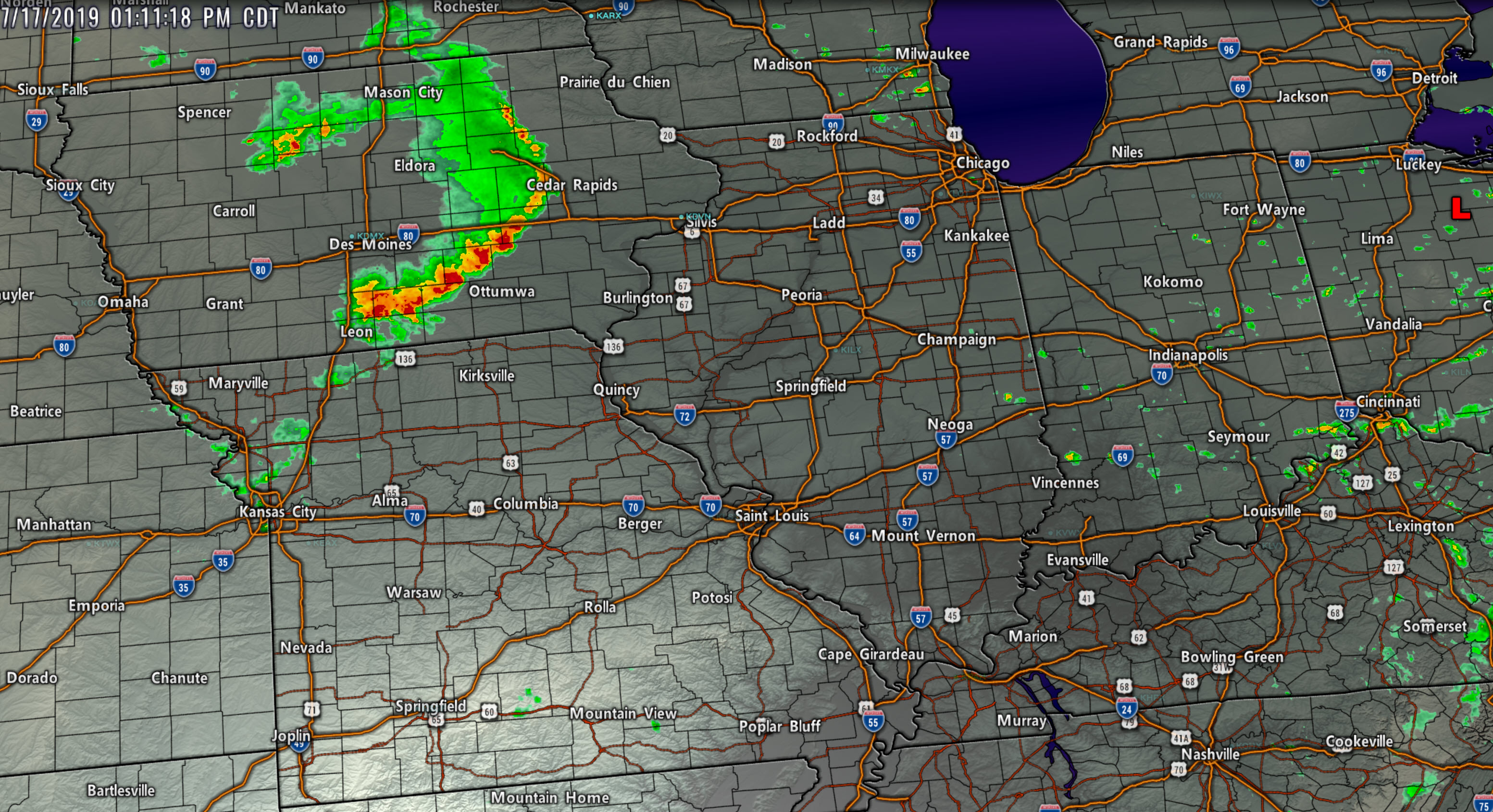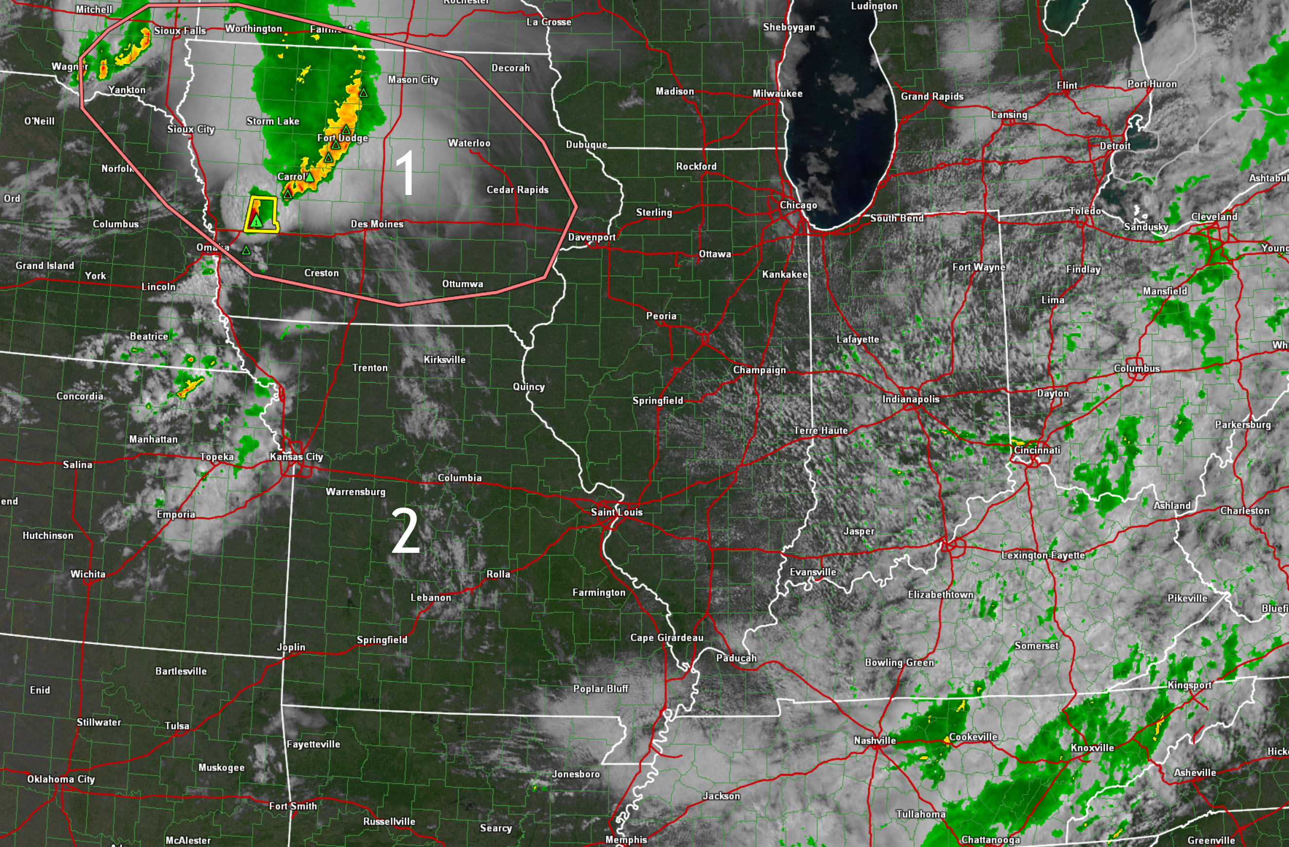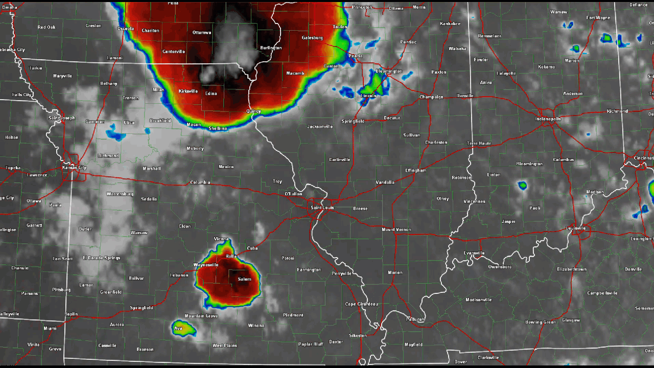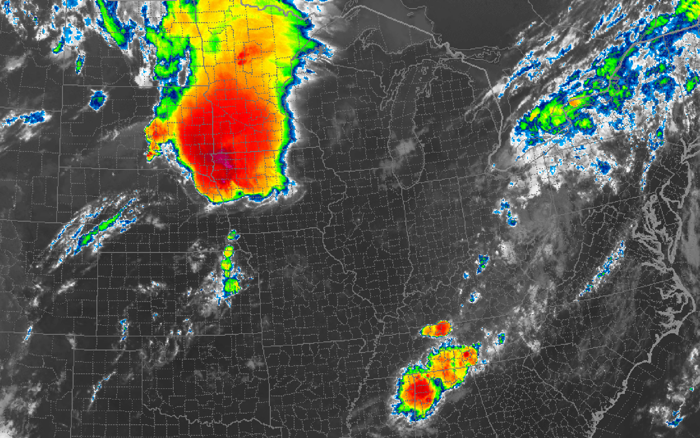 IR satellite view of our two thunderstorm complexes. The northern one came out of Iowa. The western one formed in central Missouri.