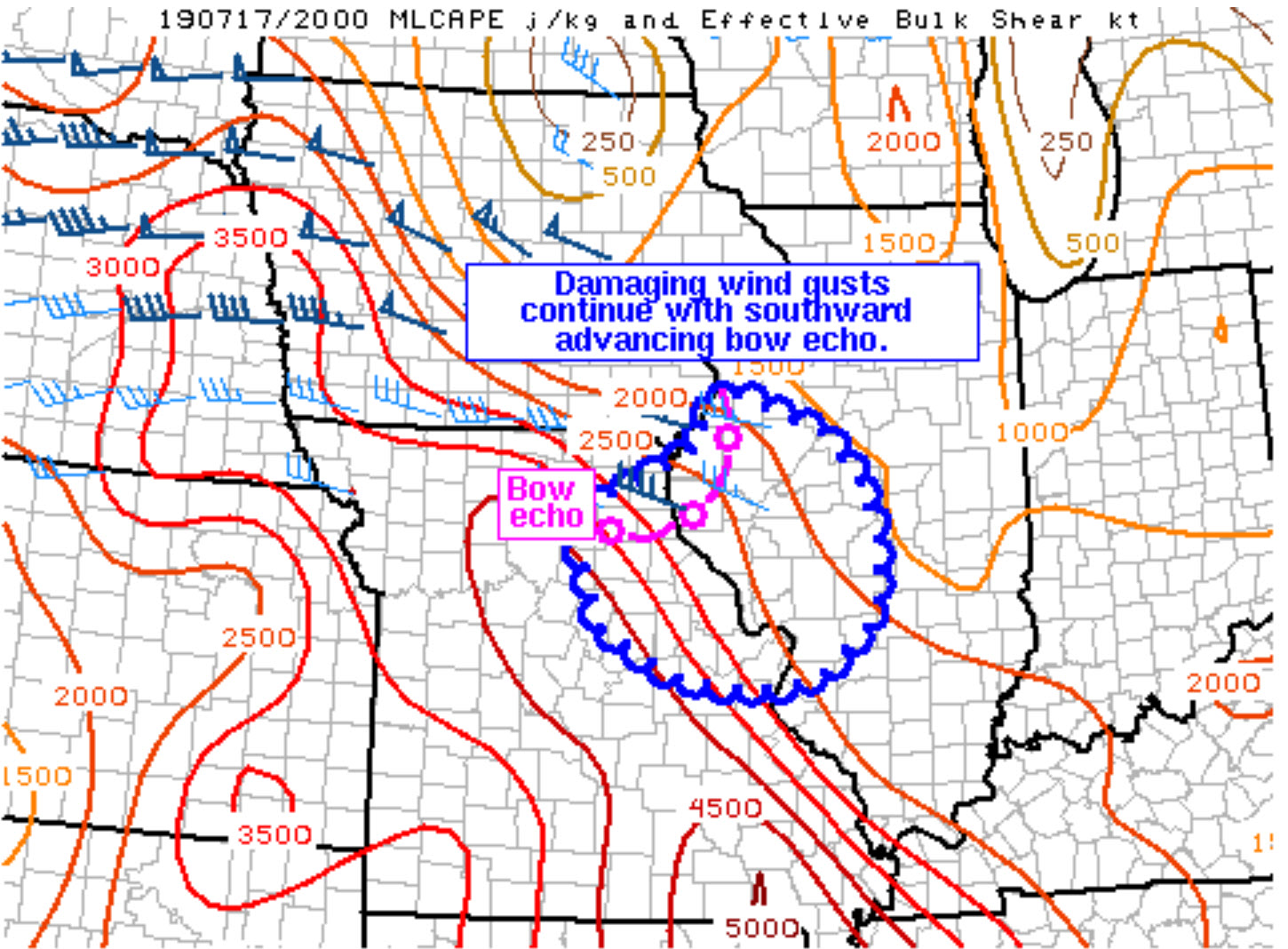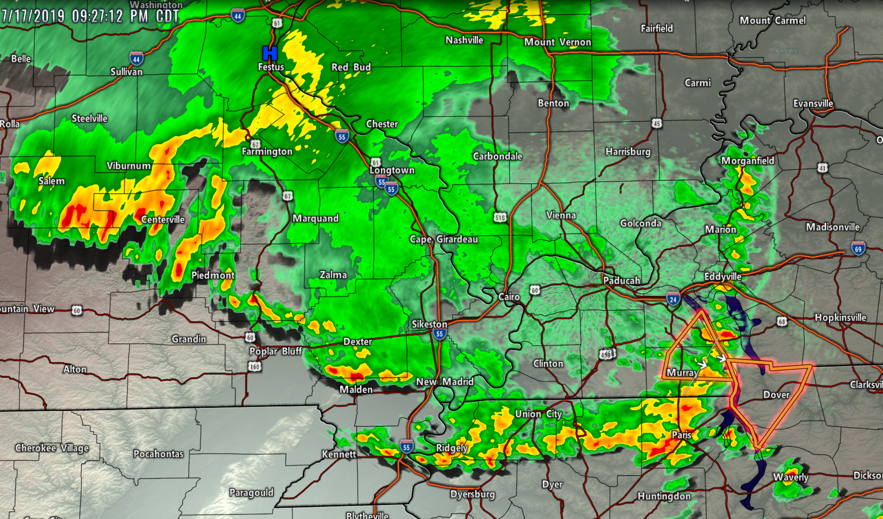 Jefferson and Franklin. Intense storms approaching from the NW. Slow movement SE at 15 to 20 mph. Sporadic patches of 50+ winds are likely with the storms. Heavy rain.