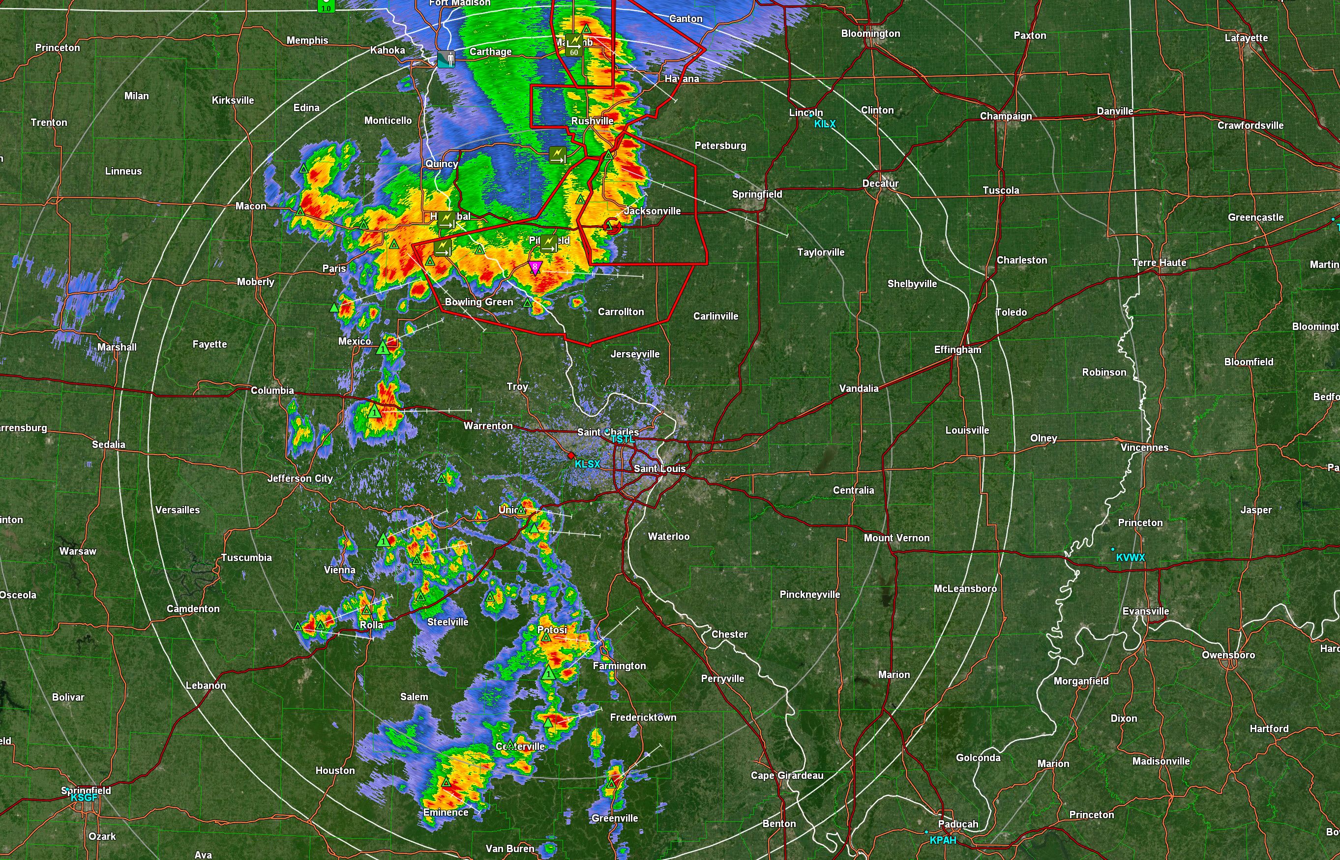 Ste Gene County, MO. Randolph/Perry County, IL. Strong storms approaching from the N NW. Pockets of high winds are possible. Small hail and frequent lightning/heavy rain. Isolated wind damage.