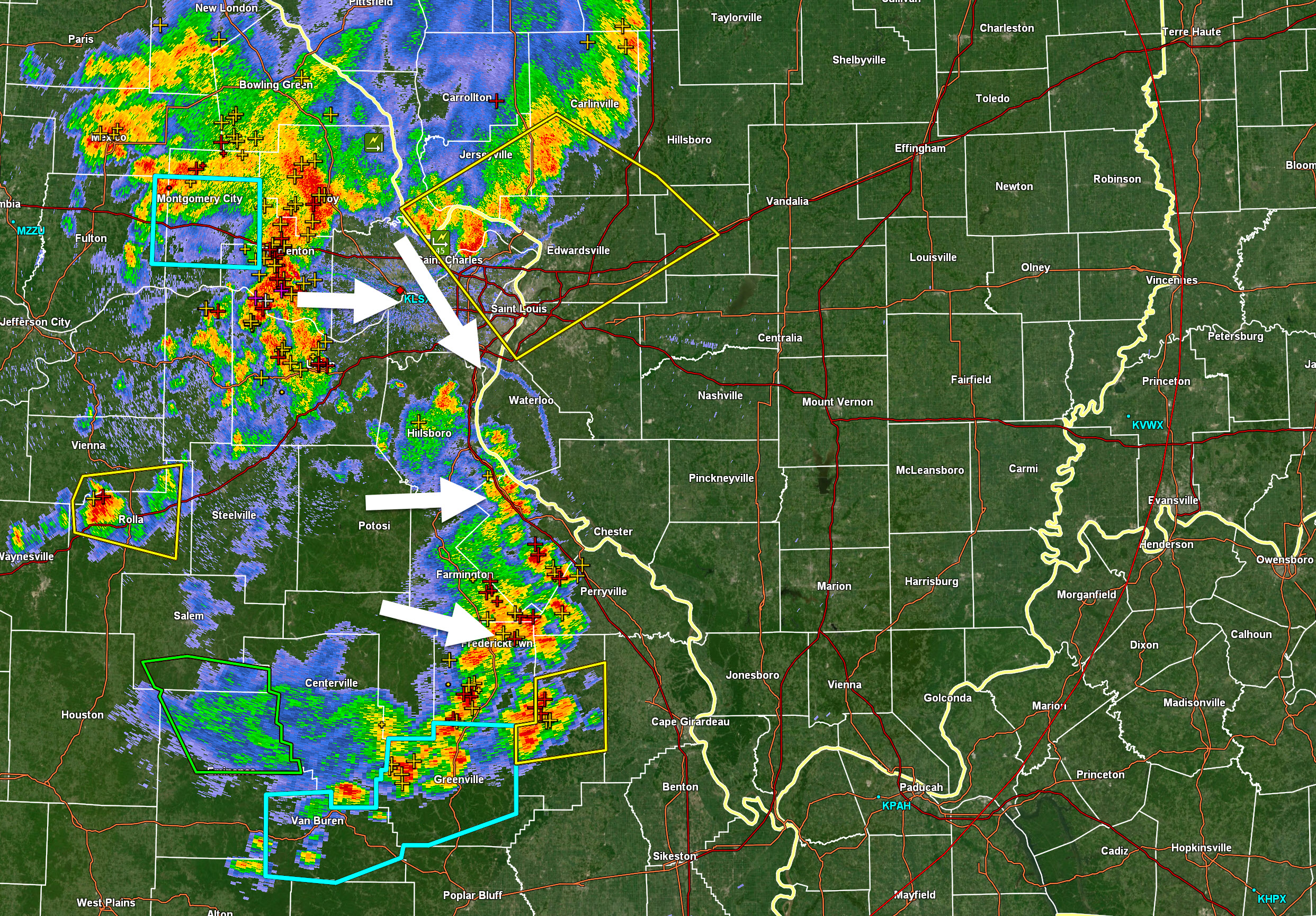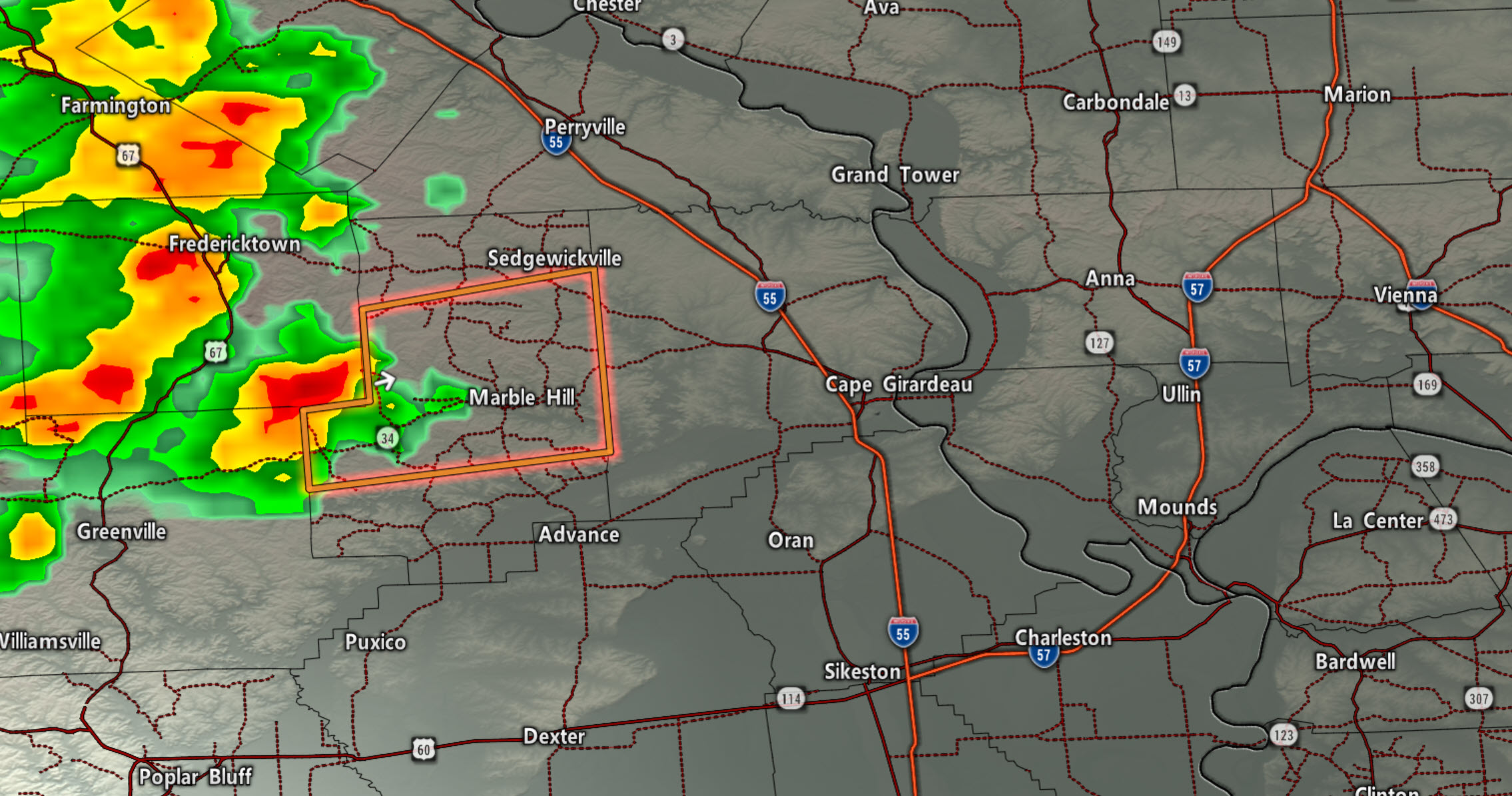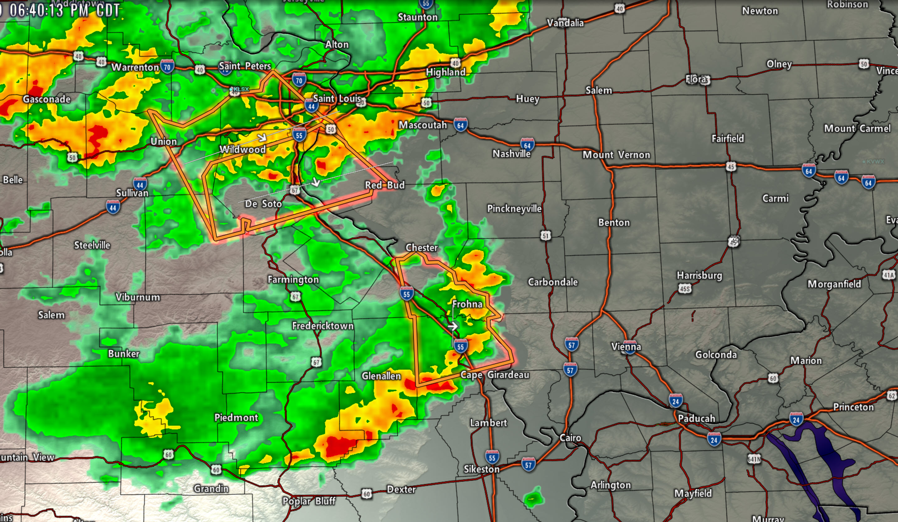 Butler, Stoddard, Scott, Alexander, Union, Jackson Counties. Incoming storms could produce pockets of 50 mph wind. Torrential downpours. They are slowly moving east/southeast at 10 to 20 mph.