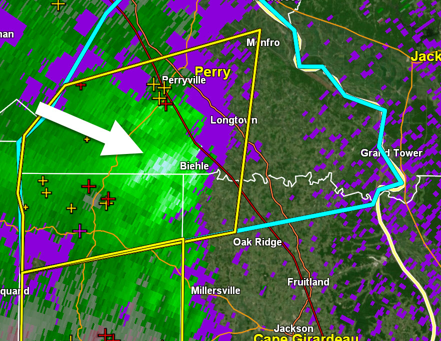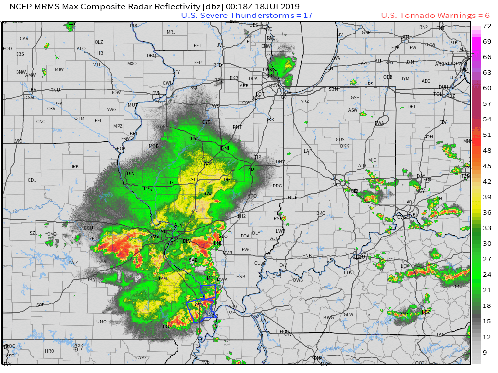 Union County, IL. Alexander County, IL. Scott County, MO. Storms continue to move E SE. Radar shows some small patches of 50+ mph winds sporadically mixed in with the storms. Wet ground conditions could mean that it is a bit easier to topple a tree. Be aware.