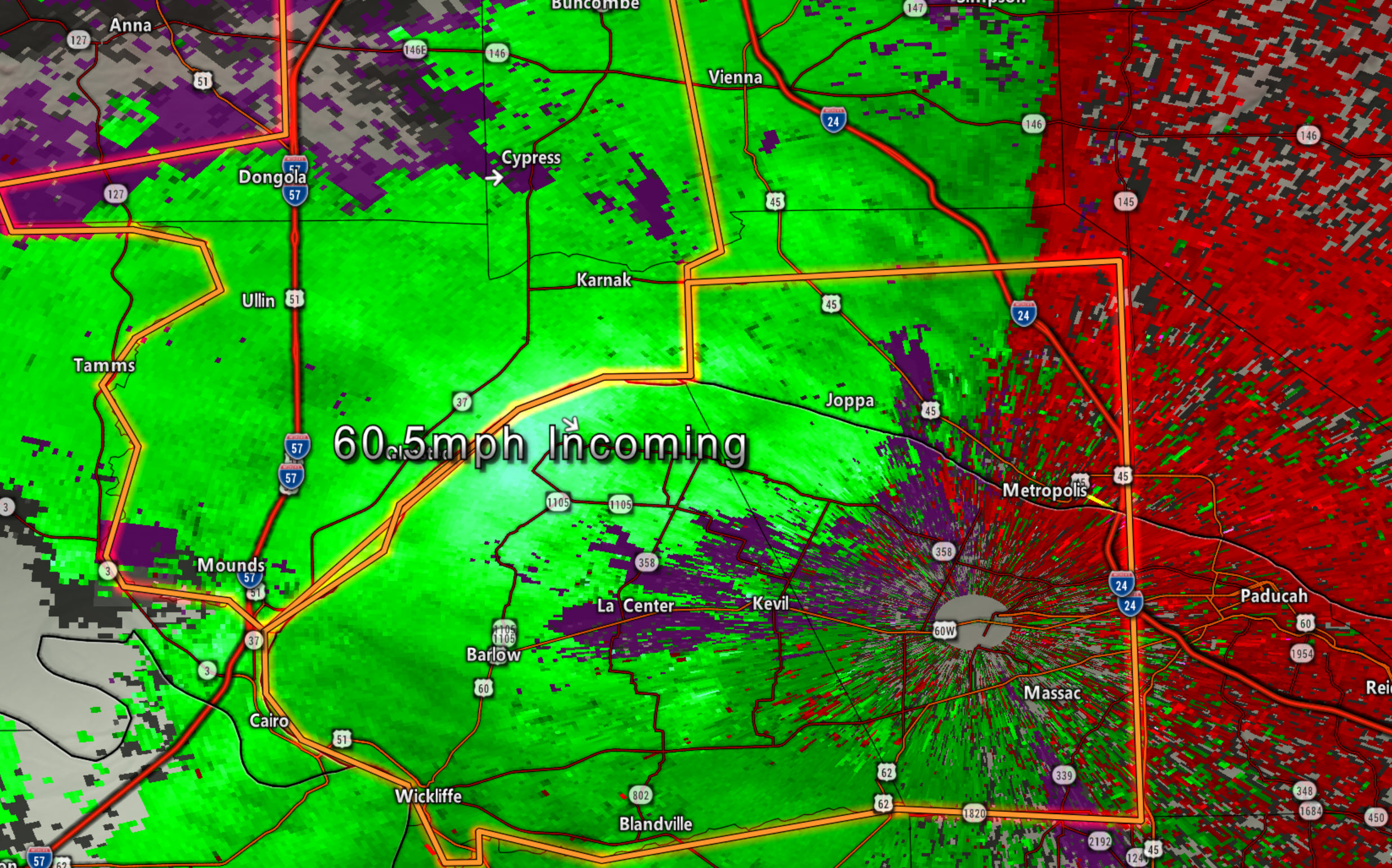 Radar shows 55 to 60 mph winds approaching extreme SW Massac County and northern McCracken County. Moving SE 20 mph.