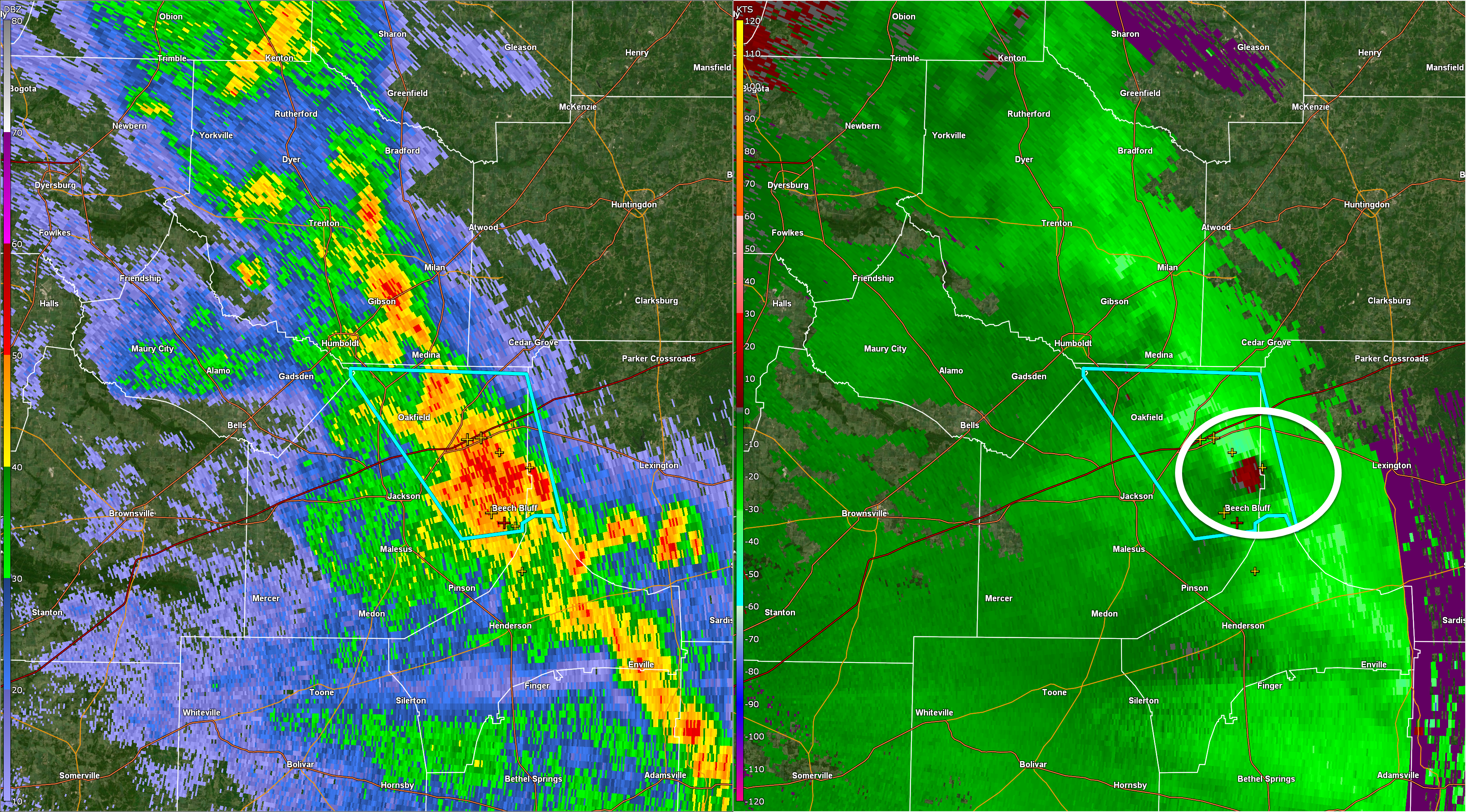 Lake, Obion, Weakley, and Henry. Storms mainly to your north/northwest are moving southward. Sporadic wind damage is possible. Very heavy rain under the storm cells.